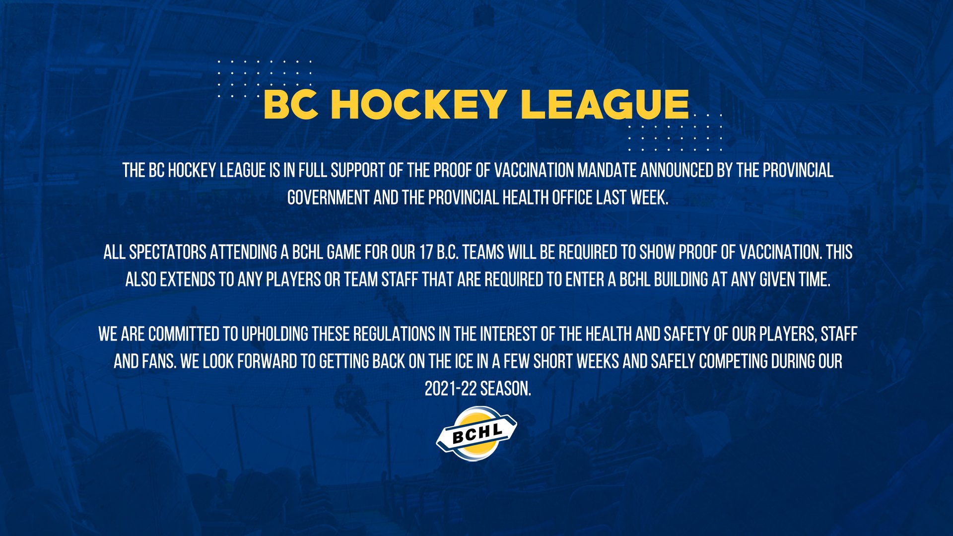 The British Columbia Hockey League announced on Twitter Tuesday that it is in support of the provincial health officer’s plan to have attendees provide a proof of COVID-19 vaccination.