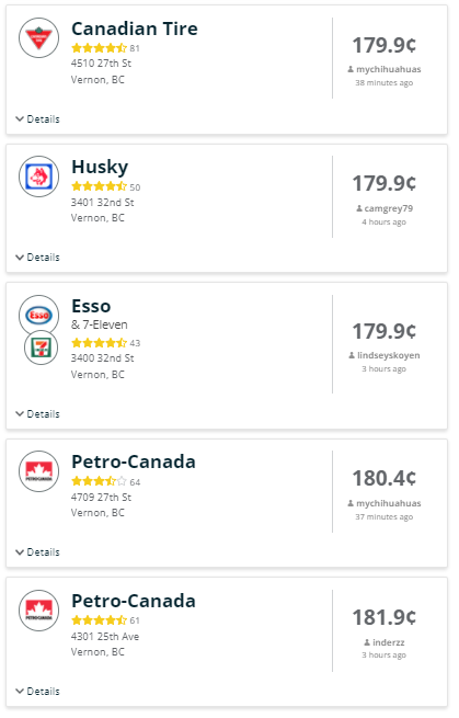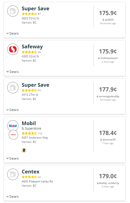 The Super Save on 27th St. was selling gasoline for $1.77.9, the Mobil on Anderson Way’s price per litre was $1.78.4, while the Centex on Pleasant Valley Rd was selling gas for $1.79 per litre.