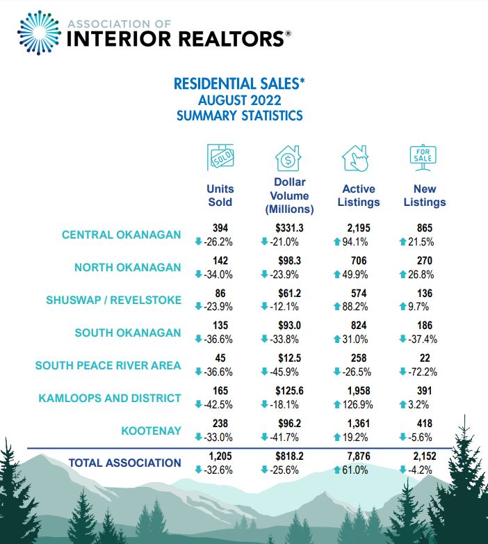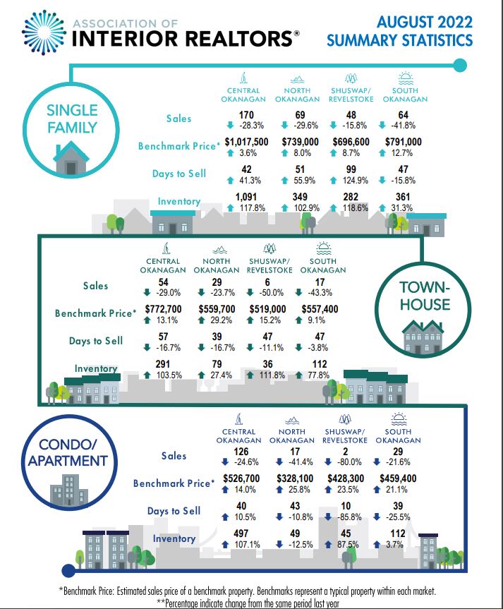 In the Central Okanagan, 394 residential units were sold, down 26 per cent. The benchmark price was $1,017,500, an increase of 3.6 per cent from August 2021.