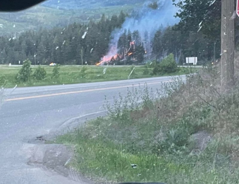 Wildfire near Schwebs Bridge on Highway 97, east of Falkland is believed to have been caused by a downed hydro line which ignited a barn. The fire is now "being held." (Photo credit: Columbia Shuswap Regional District)