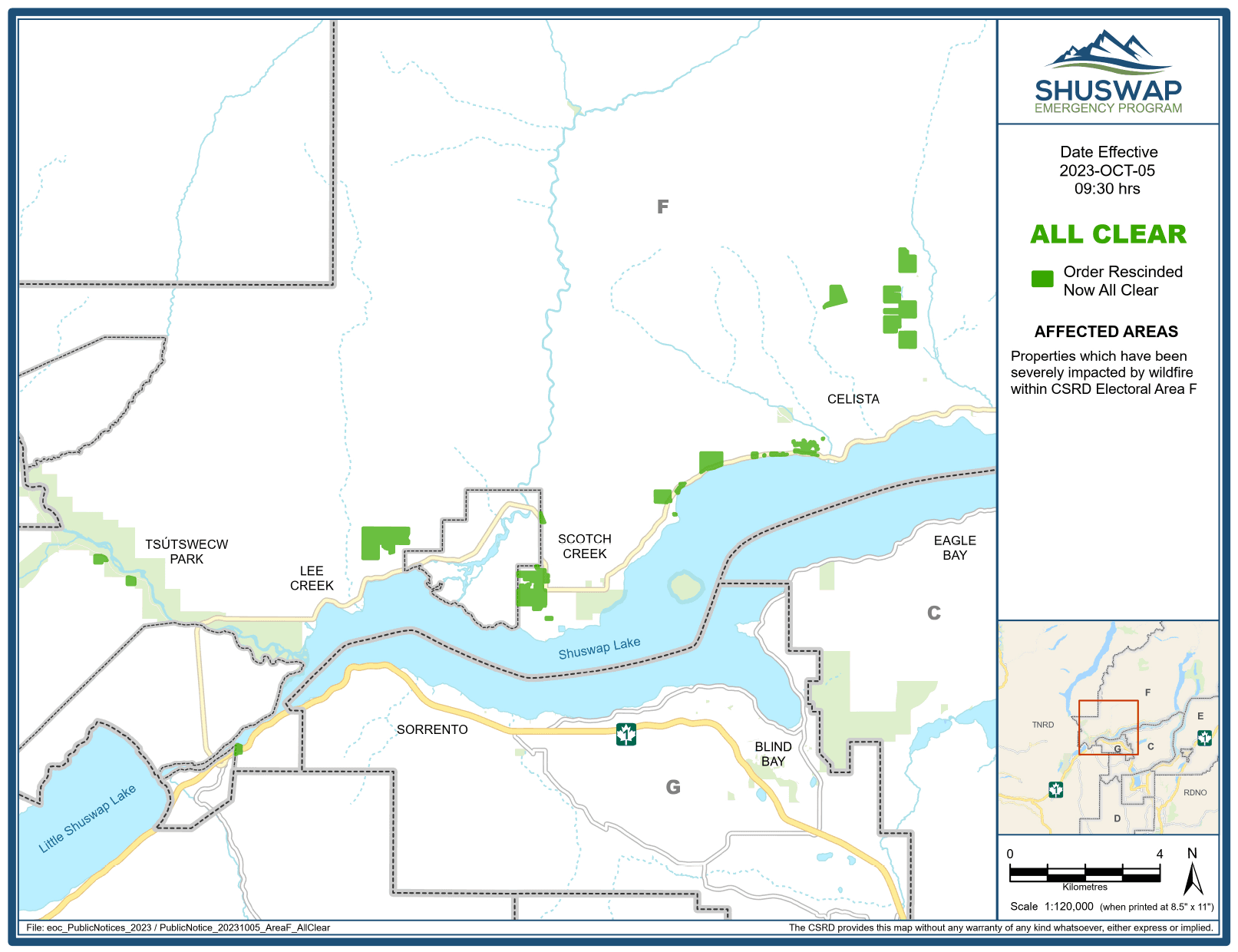 The CSRD rescinded the evacuation orders and downgraded them to all clear for the areas marked in green (image courtesy of the CSRD)The CSRD warned there may be hazards on the properties caused by the wildfires and advised people to review safety information in the Shuswap Emergency Program, Recover Shuswap and Provincial Disaster Recovery Resources prior to returning to their properties.