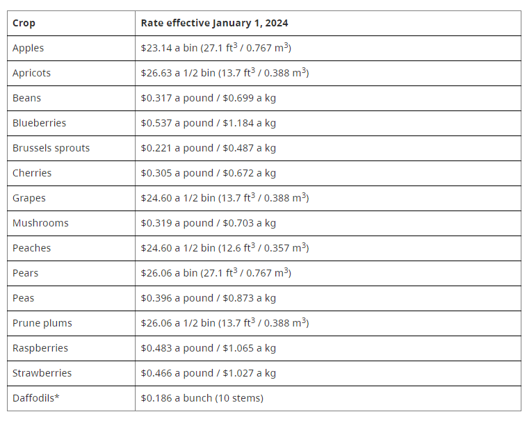 The piece-rates for hand harvesting crops starting Jan. 1, 2024 (graphic courtesy of the B.C. Government)