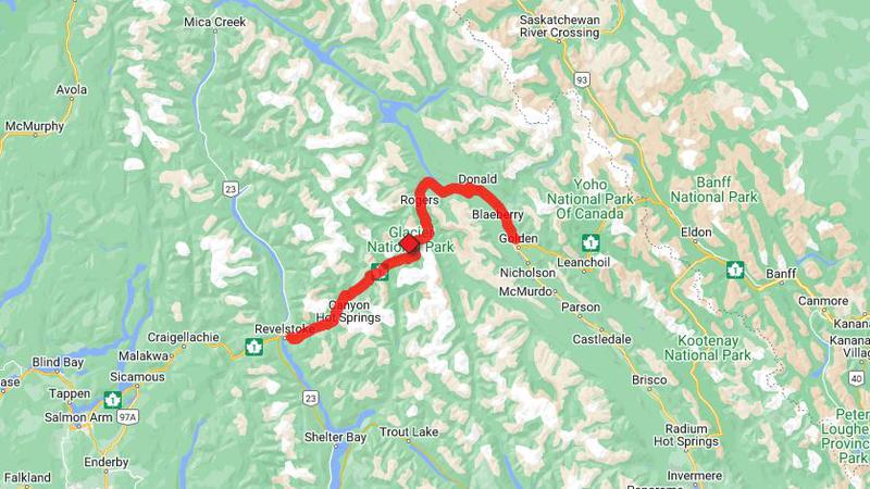 Area of Highway 1 closure between Revelstoke and Golden due to high avalanche hazard. (Image credit: Drive BC)