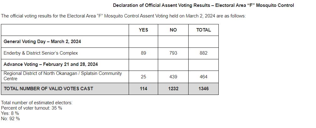 The results of a mosquito control assent vote in Electoral Area F (rural Enderby) of the Regional District of North Okanagan are now official.