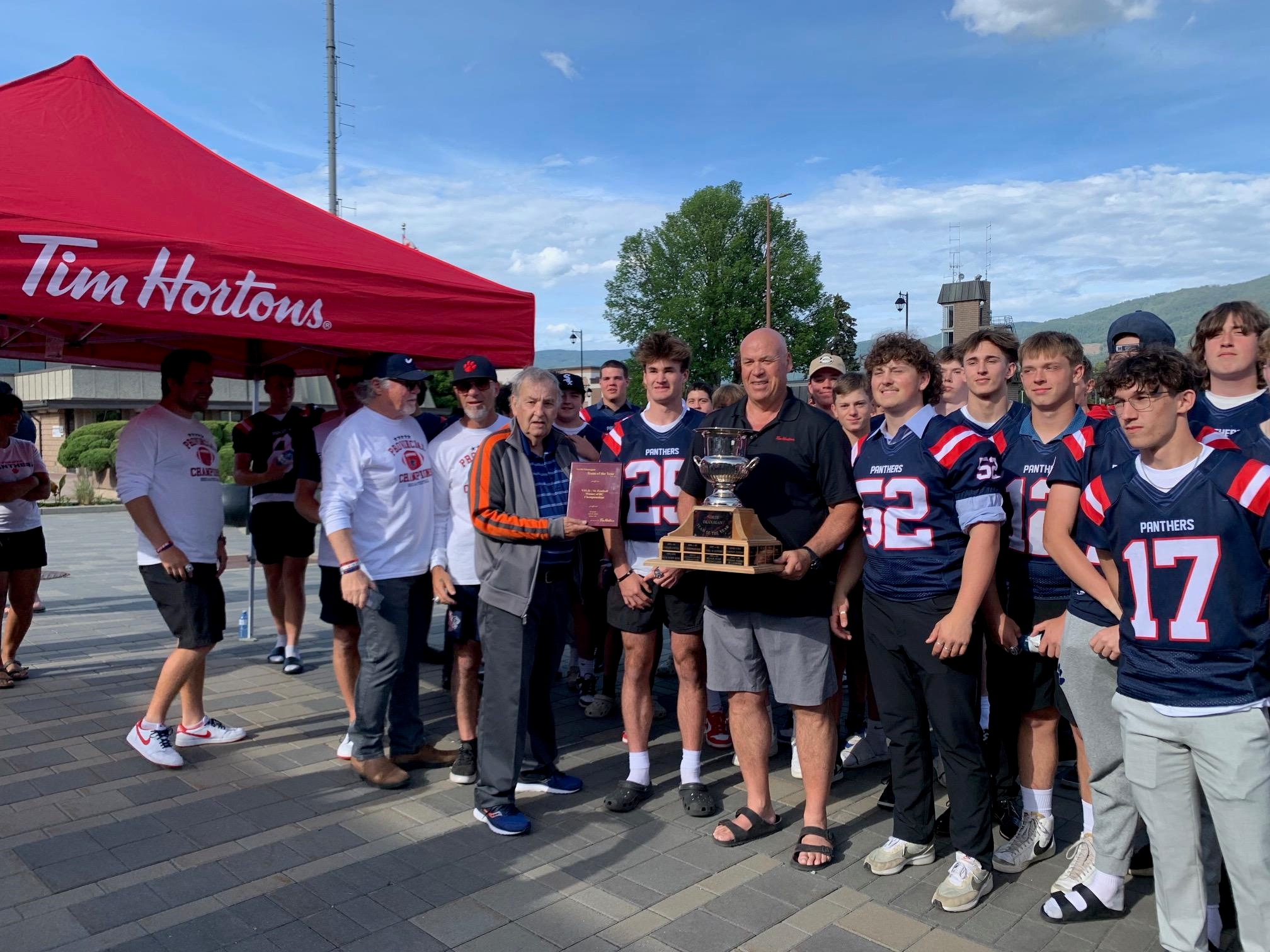 Members of the Vernon Secondary School Panthers junior and senior football teams pose with Dan Currie of Tim Hortons (with trophy) and John Topping from the awards committee after winning the Team of the Year award. (Vernon Matters photo)