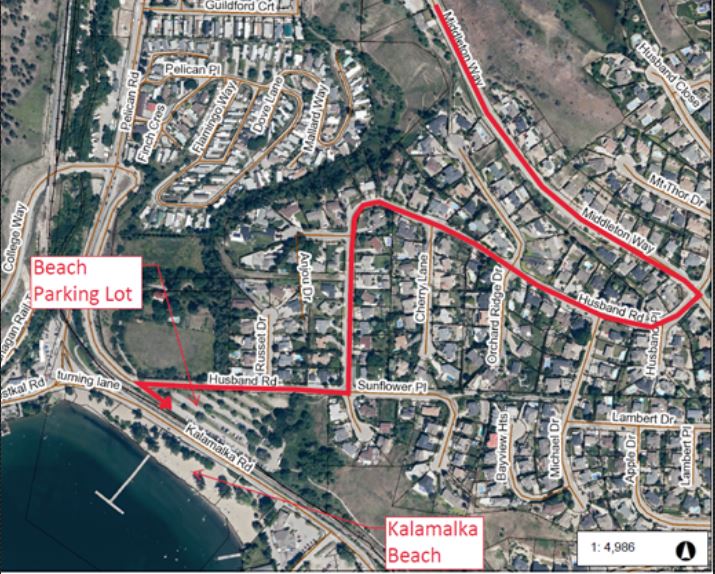“This media release is to inform visitors to Kalamalka Beach that the parking lot on Husband Road remains open, despite the potential for slight delays through the construction zone. Continue to expect lane closures and alternating traffic,” district staff stated.
