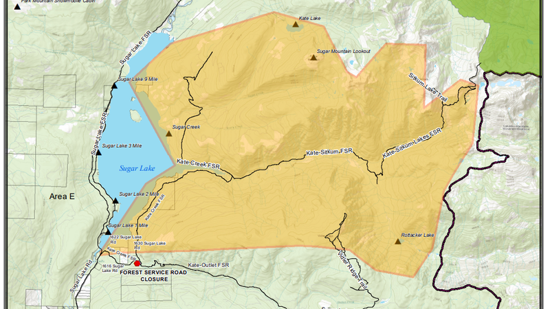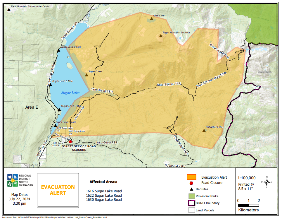 The Regional District of North Okanagan issued an Evacuation Alert for the recreation area near Sugar Lake shortly before 5 p.m. Monday, July 22.