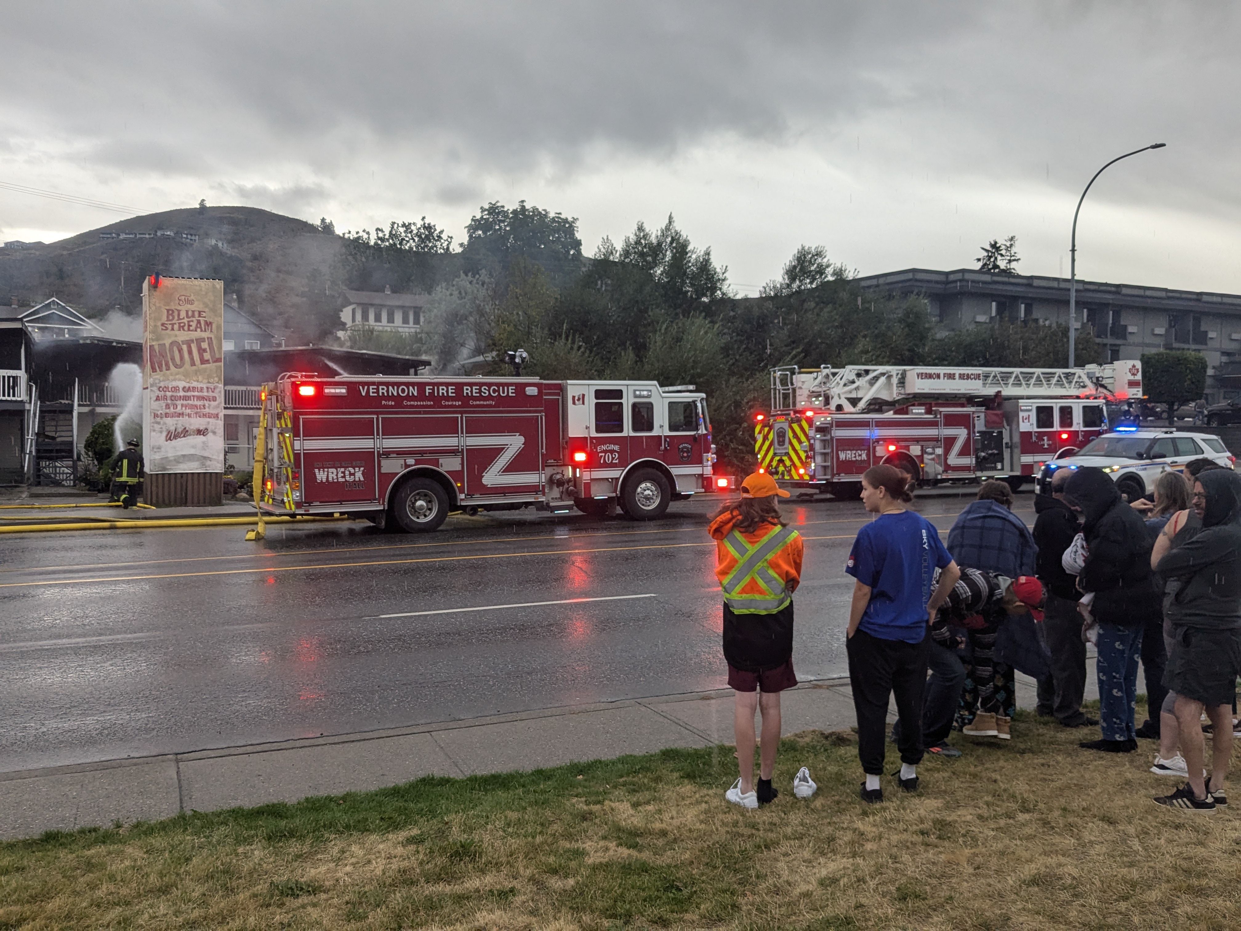 People forced to evacuate from the Blue Stream Motel after a fire broke out in the top floor Tuesday, August 27 (photo by Liam Verster / Vernon Matters)The fire in the 4200 block of 32nd Street needed the road to be closed in both directions as Vernon Fire Rescue Service crews, with assistance from the Armstrong Spallumcheen Fire Department, battled the blaze.