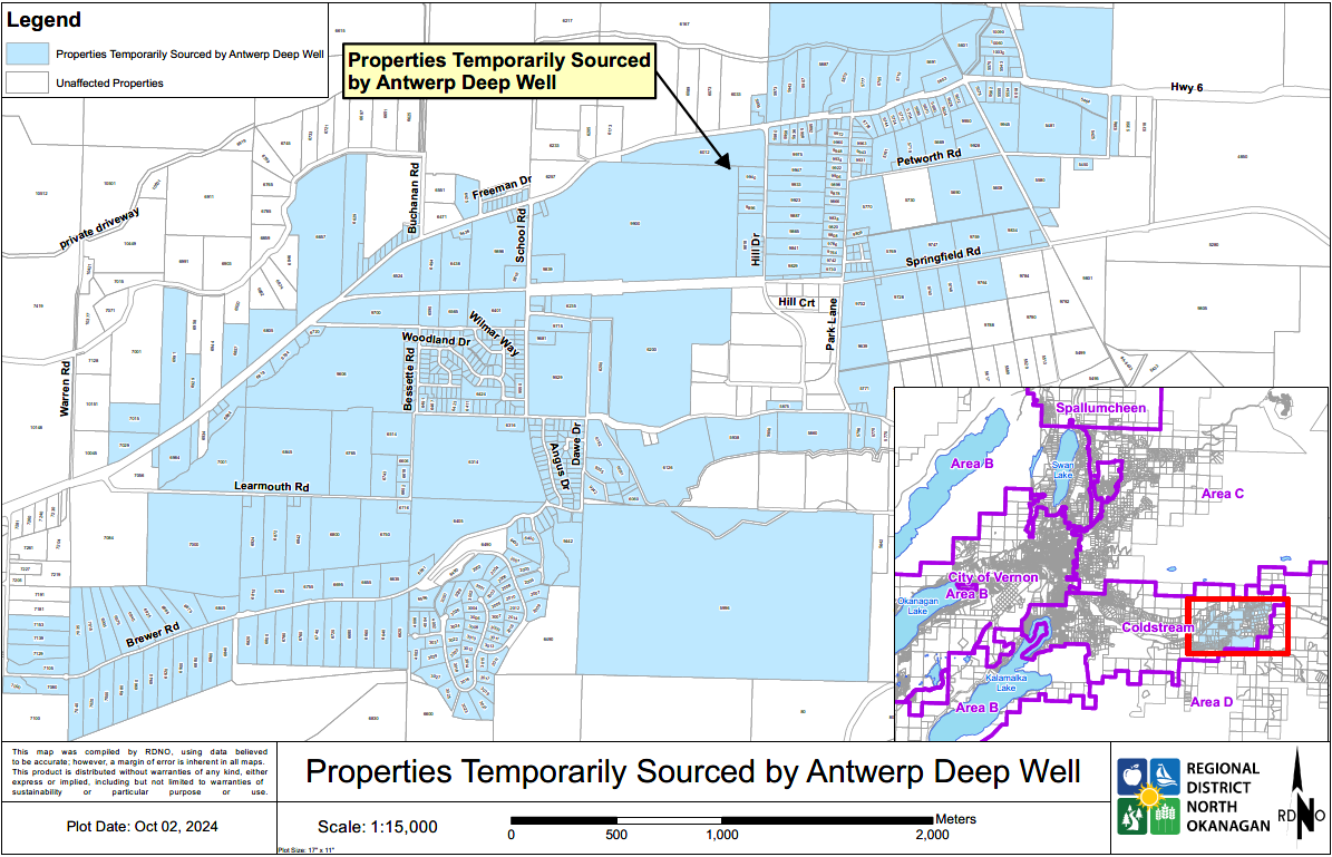 The properties that will have their water source temporarily switched from the Duteau Creek Water Treatment Plant to the Antwerp Deep Well (image courtesy of the RDNO)