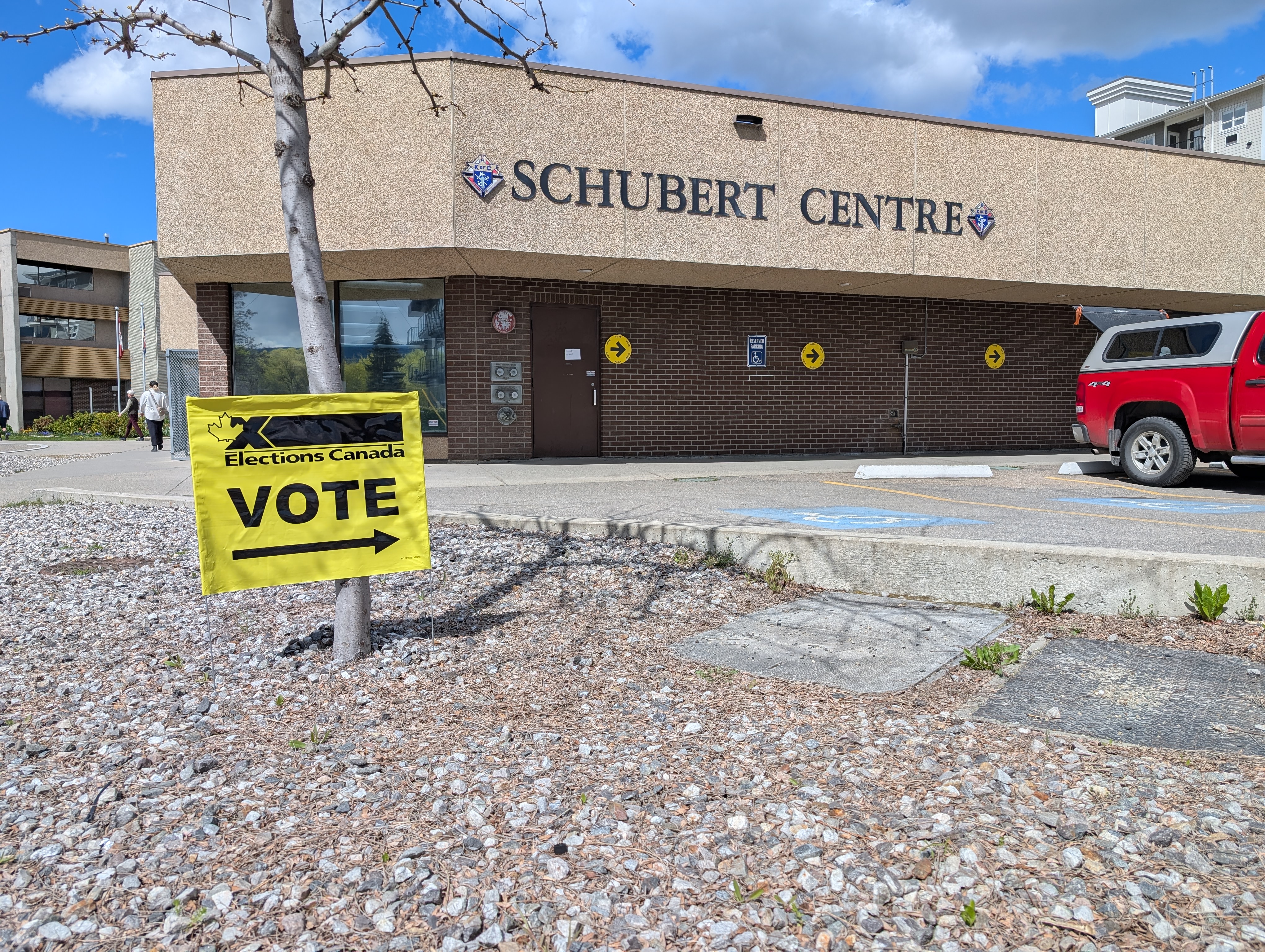 People lined up at the Vernon Recreation Centre to cast an early vote in the 2025 Federal Election Monday, April 21 (photo by Liam Verster / Vernon Matters)Vernon Matters also visited the Schubert Centre polling station, where the lineup was contained to within the building. Voters said it took about 15 minutes to get through the whole process.