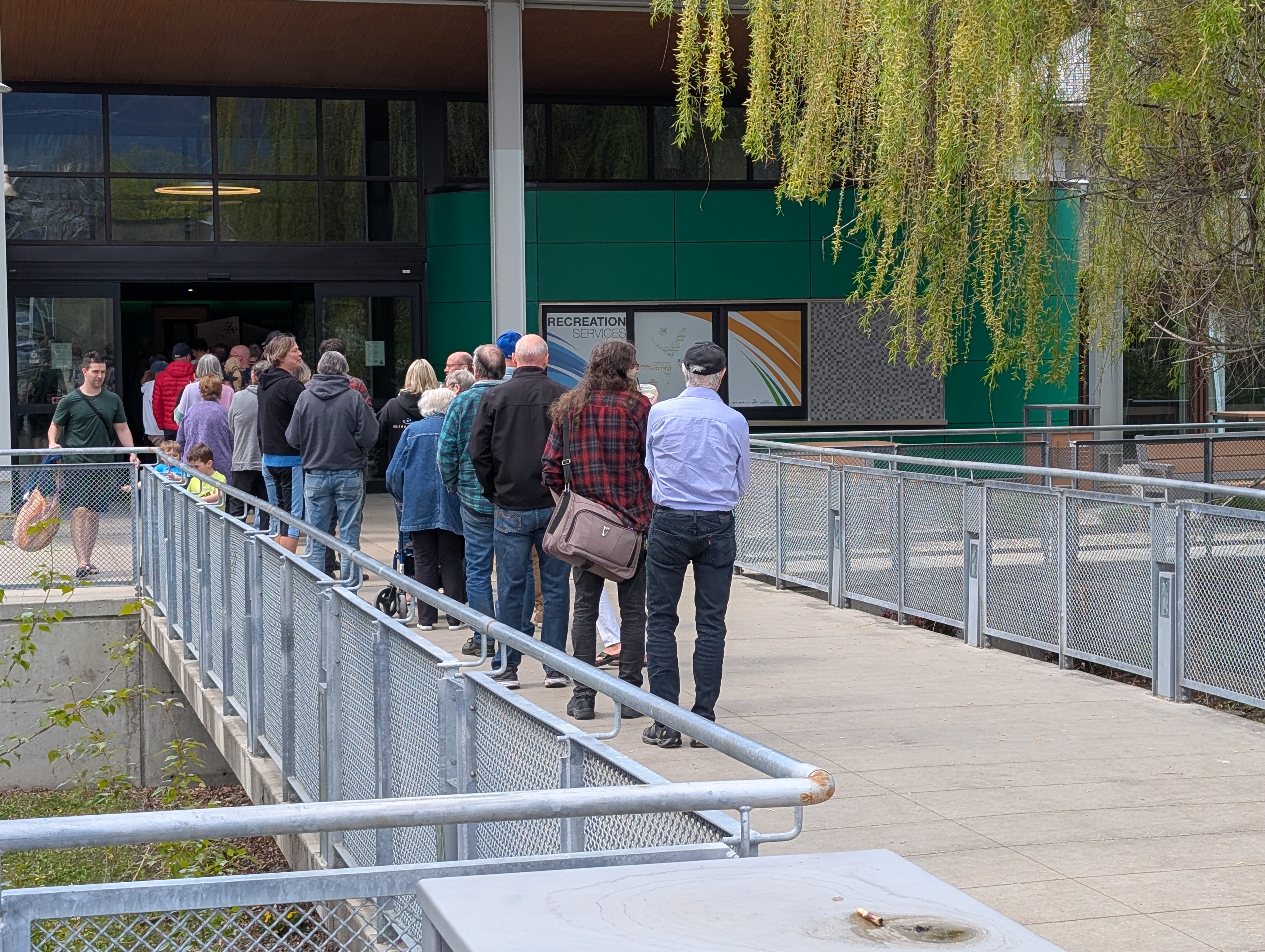 People lined up at the Vernon Recreation Centre to cast an early vote in the 2025 Federal Election Monday, April 21 (photo by Liam Verster / Vernon Matters)Vernon Matters also visited the Schubert Centre polling station, where the lineup was contained to within the building. Voters said it took about 15 minutes to get through the whole process.