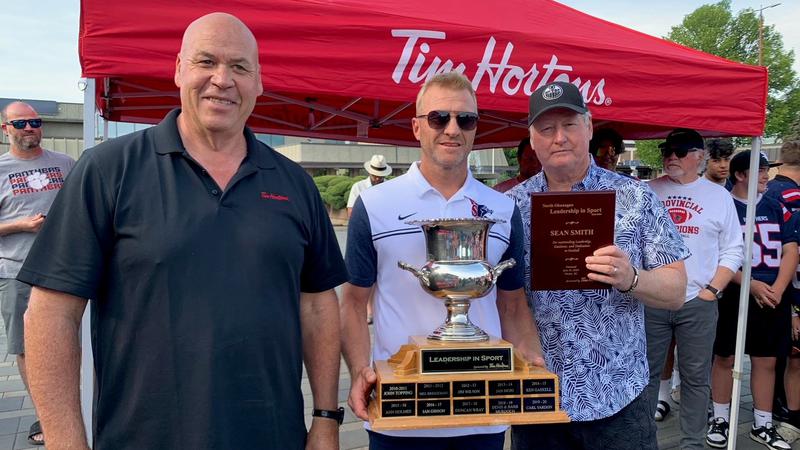 VSS football coach Sean Smith (centre) receives Leadership in Sport award from Dan Currie of Tim Hortons (left) and Kevin Mitchell of the awards committee. (submitted photo)