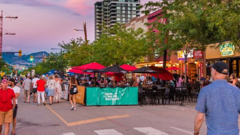 Meet Me on Bernard will begin Friday, May 16, turning Bernard Avenue between Abbott and Pandosy streets into a pedestrian-only corridor for the summer. The program has been extended to Sept. 14 this year in celebration of Kelowna hosting the Canadian Country Music Awards.