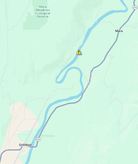 The yellow marker indicates the location of the sinkhole on Riverside Road, north of Grindrod (image courtesy of DriveBC)Riverside Road, which runs alongside Shuswap River, connects to Highway 97A north of Grindrod and at Mara, south of Mara Lake.