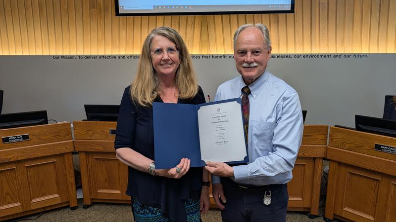 Elma Hammin, Director of Financial Services, and Mayor Victor Cumming, with the Government Finance Officers Association Award (photo by Liam Verster / Vernon Matters)