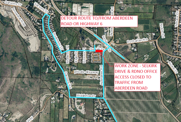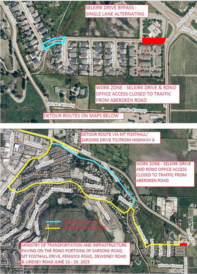 The road will be closed Monday to Friday from 7 a.m. to 5 p.m., with some additional closures over the weekend possible, until the work is completed in early July. The work will also impact access to the Regional District of North Okanagan office on Aberdeen Road.