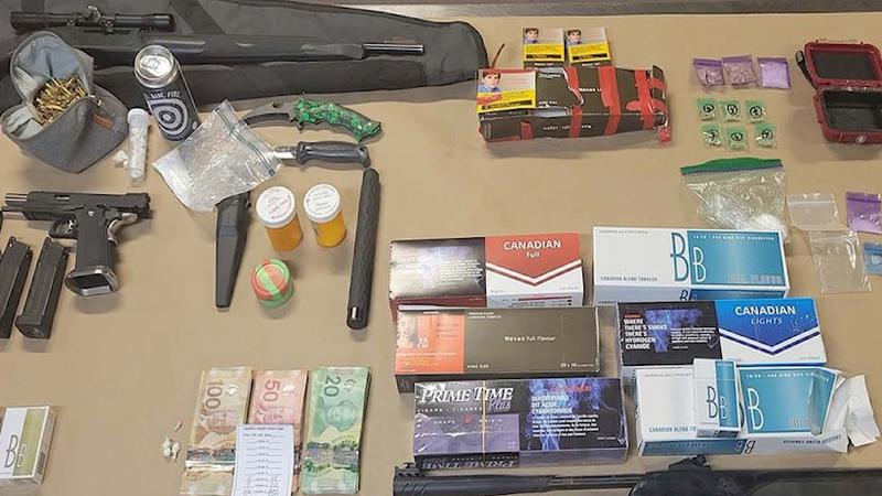 During the busts, officers seized a rifle with ammo, two replica firearms, illegal weapons, over $3,100 cash, six cartons of illegal cigarettes, and various drugs, including fentanyl, cocaine, hydromorphone, crack, and meth.