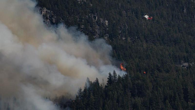 A helicopter carrying a water bucket flies past the Lytton Creek wildfire burning in the mountains near Lytton, B.C., on Sunday, Aug. 15, 2021. THE CANADIAN PRESS/Darryl Dyck