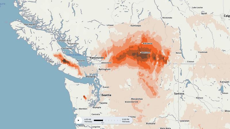 AccuWeather’s smoke radar indicates the haze will remain over the valley until at least 1 p.m., affecting visibility and air quality across much of the central and southern Okanagan.