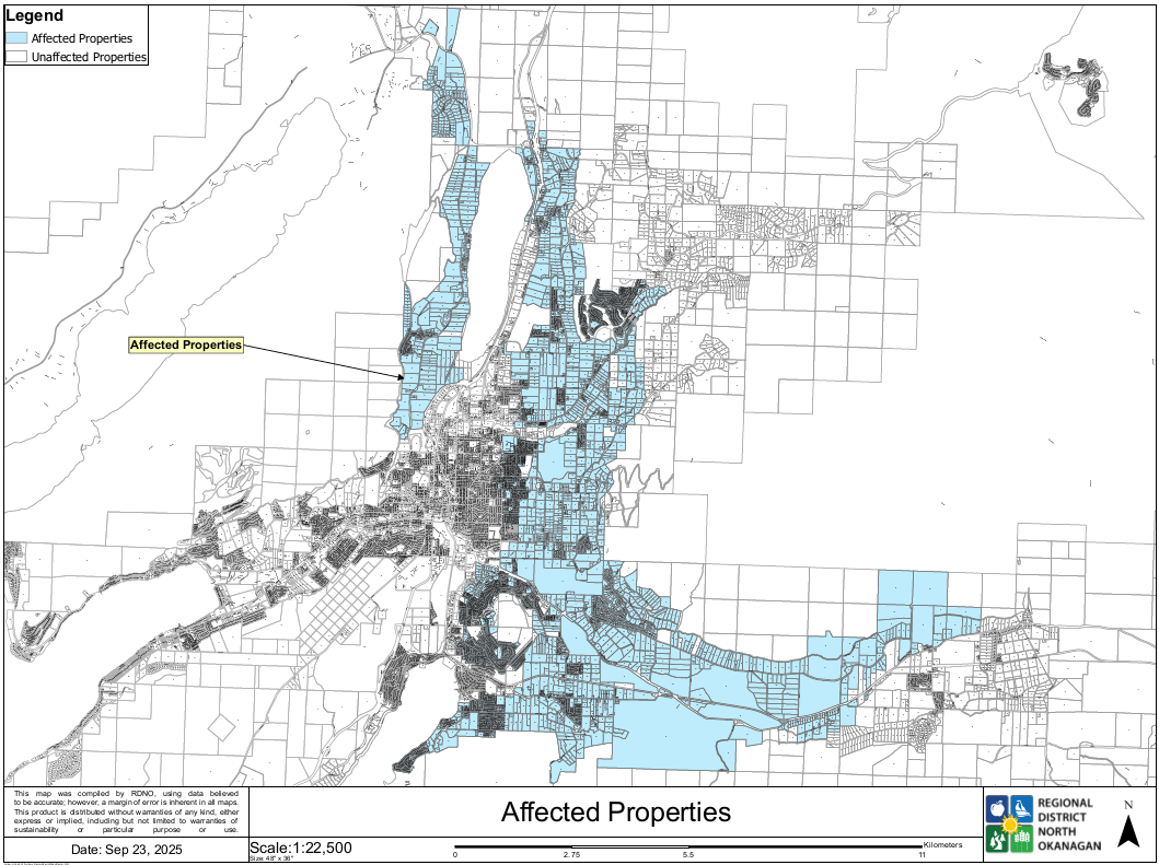 Properties switching from the Duteau Creek to the Kalamalka Lake water source starting Oct. 6 (image courtesy of the RDNO)