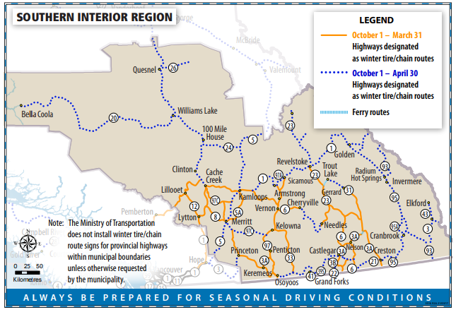 Starting Oct. 1, vehicles travelling on most B.C. highways will be required by law to be equipped with winter tires. Those include Highways 97, 6, 5/Coquihalla, and 1/Trans Canada.