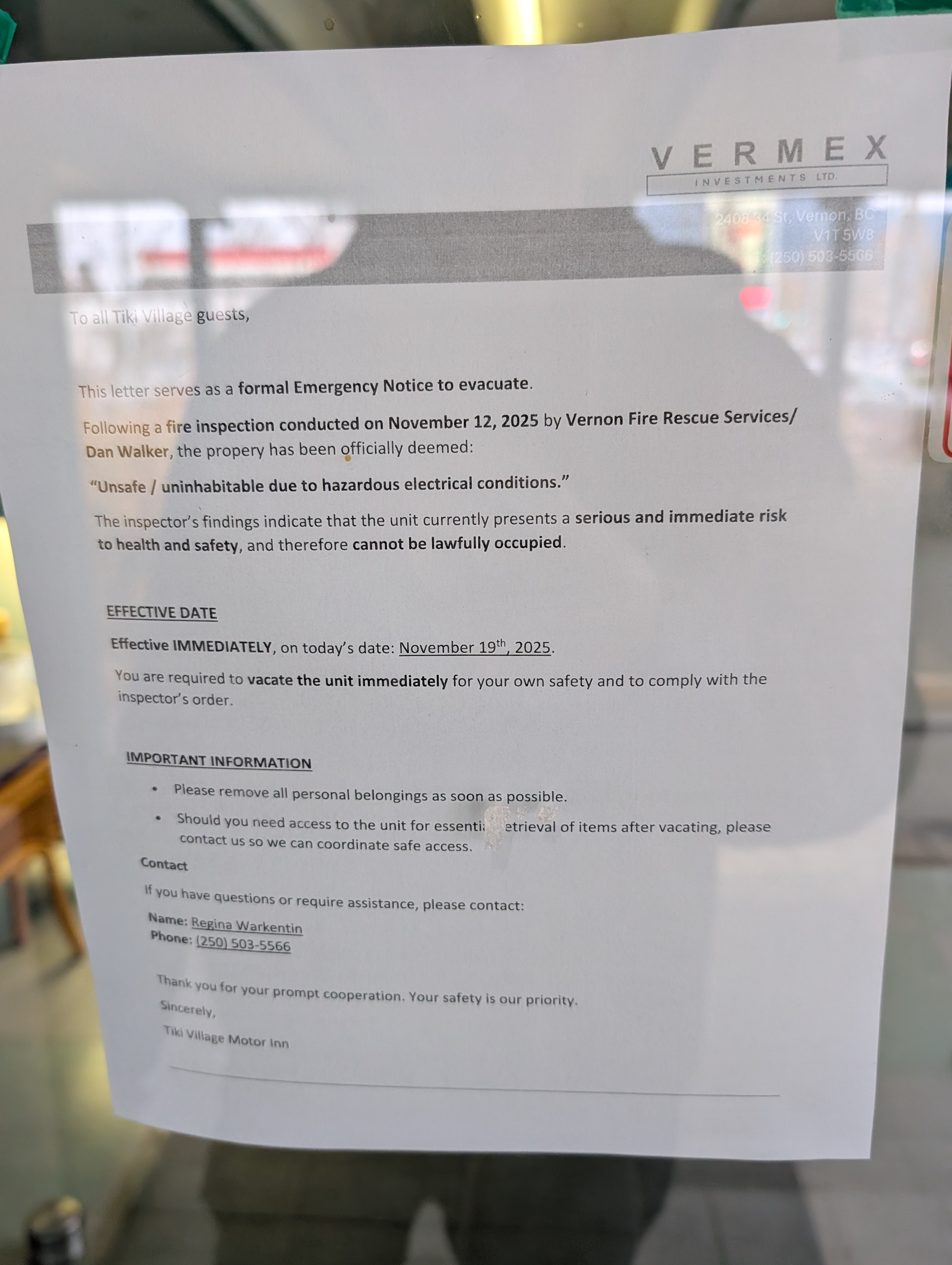 The City of Vernon said Vernon Fire Rescue Services (VFRS) identified numerous fire code violations and safety concerns at the Village Tiki Motor Inn over the past several months.