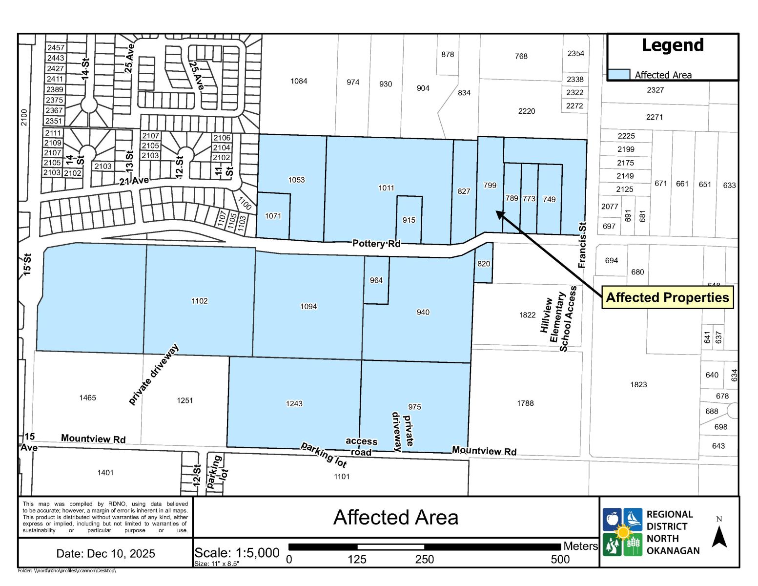 Properties affected by the water main break (image courtesy of the RDNO)The RDNO said the water main break resulted in a loss of water pressure, though the break was being repaired and flushing was expected to be completed late Wednesday.