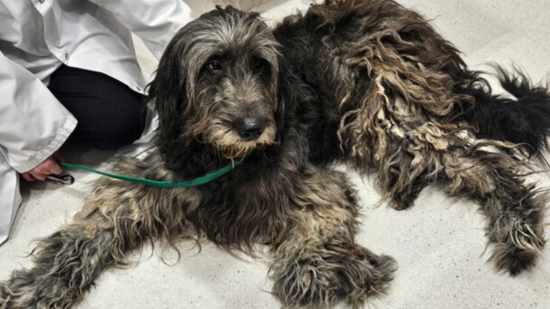 The dog, which has been named Shaggy, has been suffering from chronic skin and ear infections for some time, along with swollen and inflamed genitals, a yeast infection, possible urinary tract infection, and a possible eye infection due to previous trauma. He also has a perineal hernia.