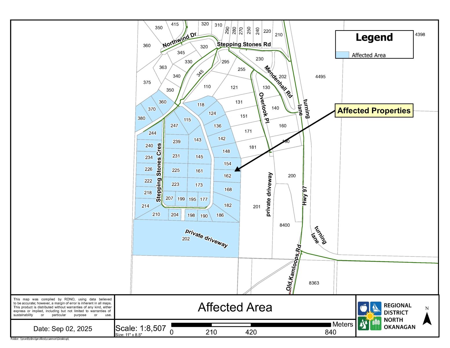 The Regional District of North Okanagan issued the notice for properties on Stepping Stones Crescent and Stepping Stones Road Tuesday, Dec. 16, after a power outage caused a loss of water pressure in the system.