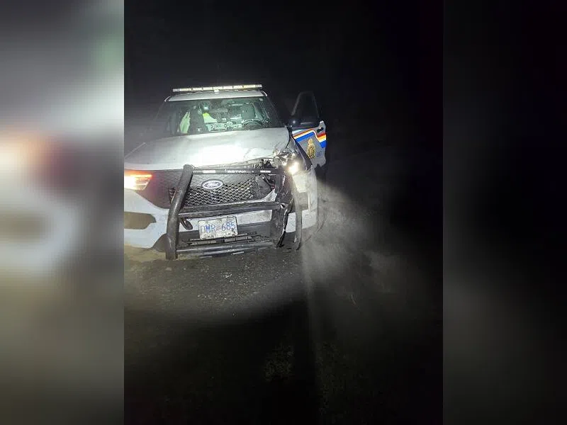 A police cruiser was taken out of rotation after being rammed while in pursuit of a stolen truck in the Shuswap.