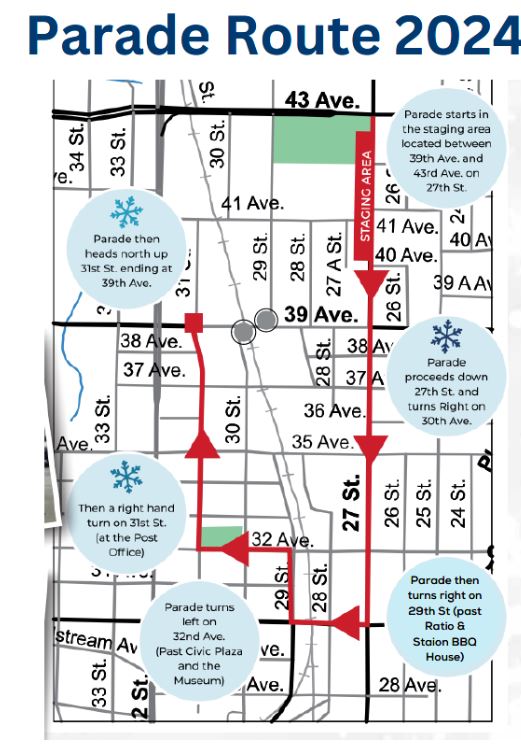 The Carnival parade begins at 12:00 p.m. at 43rd Avenue by Seaton Secondary and travels southbound on 27th Street to the courthouse, then westbound on 30th Avenue.