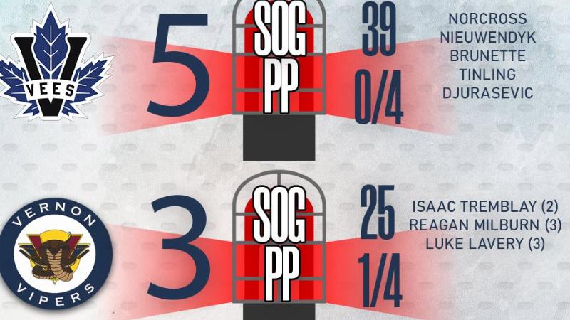 The Vernon Vipers ended the BC Hockey League's exhibition season with three wins and three losses after falling 5-3 to the Penticton Vees on Friday. A crowd of 458 fans was on hand for the game at Kal...